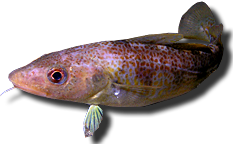 vor einem ca. 1 Meter langen Lengfisch, der regungslos auf dem Grund