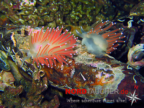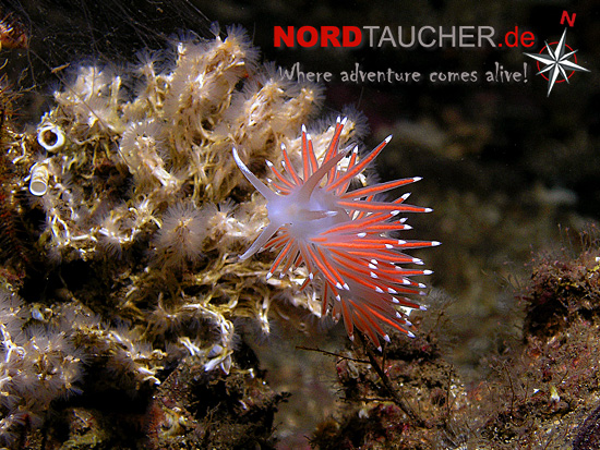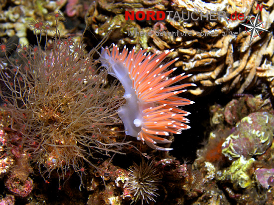 Fadenschnecke (Coryphella pellucida) bei der Jagd auf Polypen
